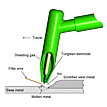 In welding is part of the base material melted. Heating sources can be gas, electric arcs, laser beams, a.o. For some of the processes an electric arc provides the heat. In other cases it comes from the electric resistance between two surfaces. Soldering processes uses another more low melting metal as binding agent. This means that the base material is not melted. The heating source is typically gas. Adhesive bonding, also known as gluing, uses a binding agent (often a polymer) to join two surfaces. |