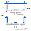 A sheet of thermoplastic material is heated to the softening point. The sheet is positioned over a mould with small air canals, and a vacuum pulls the sheet into the mould. Vacuum is normally sufficient due to the low strength in the material being formed, but for a more complex geometry, additional air or mechanical pressure can be applied. |