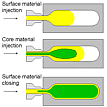 Sandwich plastic parts with different types of plastic inside and on the surface can be produced using this process. In this way parts with high quality surfaces can be made from plastic types with low surface quality.