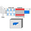 A set of fibres is pulled through a plastic bath and then through a heated die which give the profile its shape. After the die the profile is cooled by air or water and cut into desired lengths. An advantage for the process is that it is a relatively inexpensive way to produce reinforced parts with long fibres. Strength and other properties are better in the fibre direction than across. |