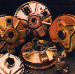 This steel plate is part of an electric motor and precisely one end of it. Zinc plating and following chromating (yellow colour) give corrosion protection. Zinc protects steel, whereas chromium protects the zinc layer. |